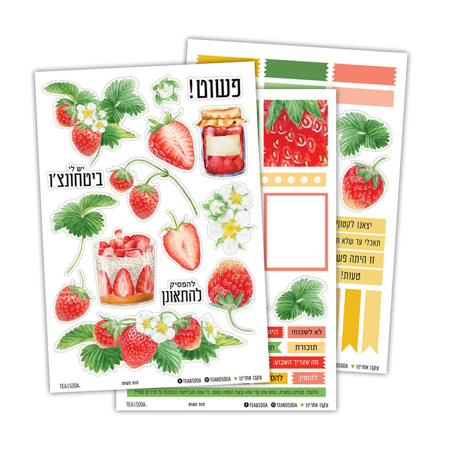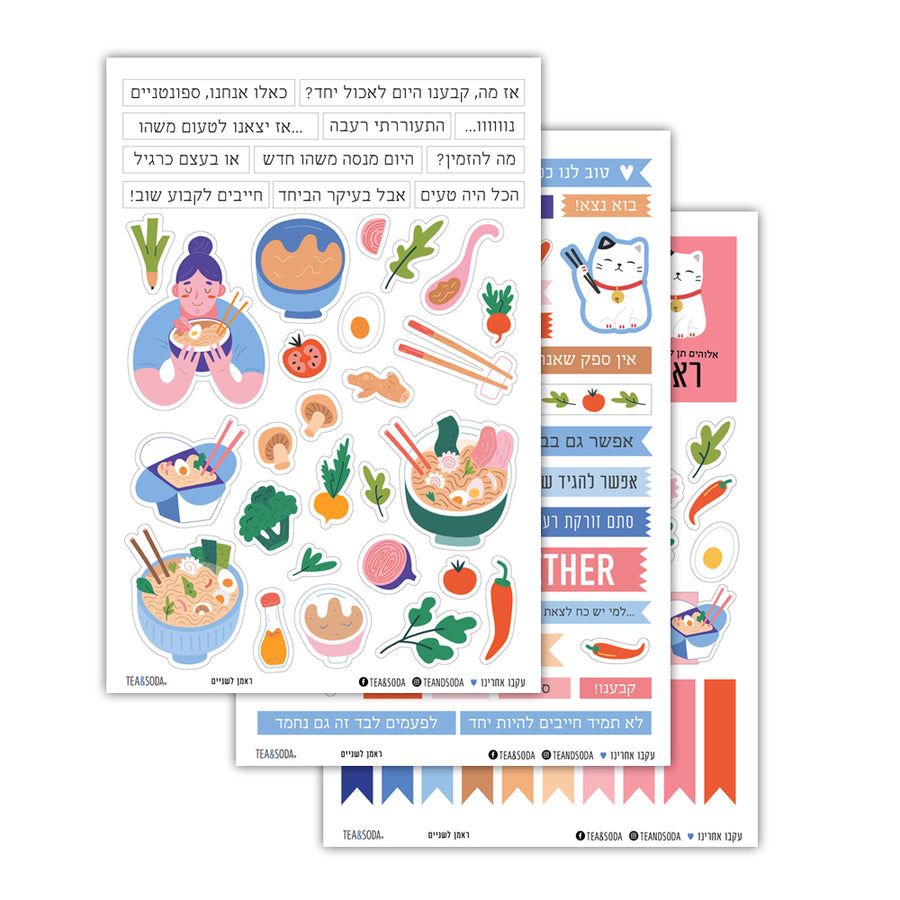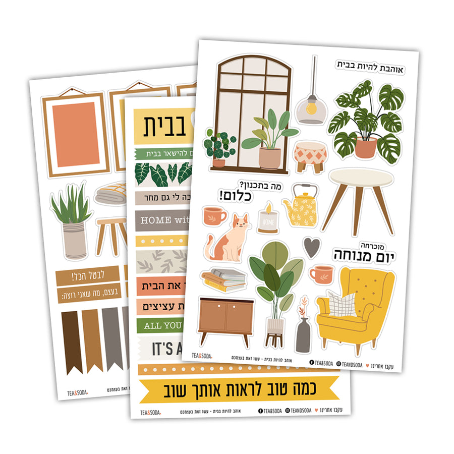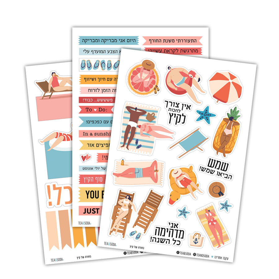 מארז מדבקות ליומן, מכיל איורים, אלמנטים צורניים וטקסטים לתכנון וקידום עשייה. המדבקות ניתנות לשימוש גם כמדבקות לברכות, עיצוב אלבומים, כרטיסי ברכה, אריזות ועוד. שלושה דפים במארז