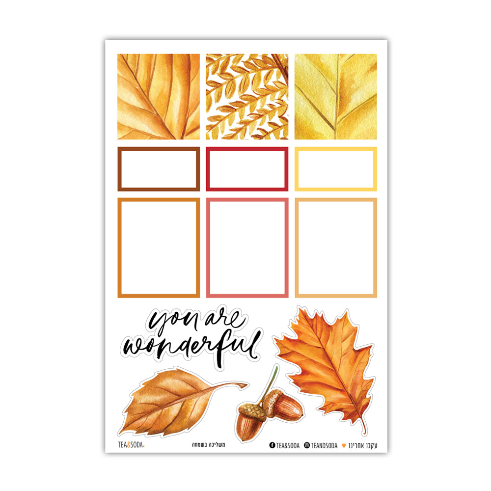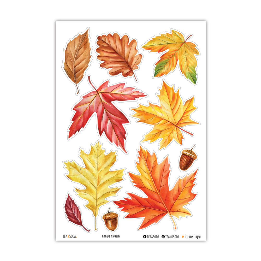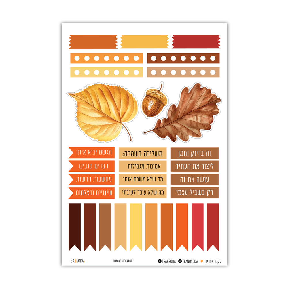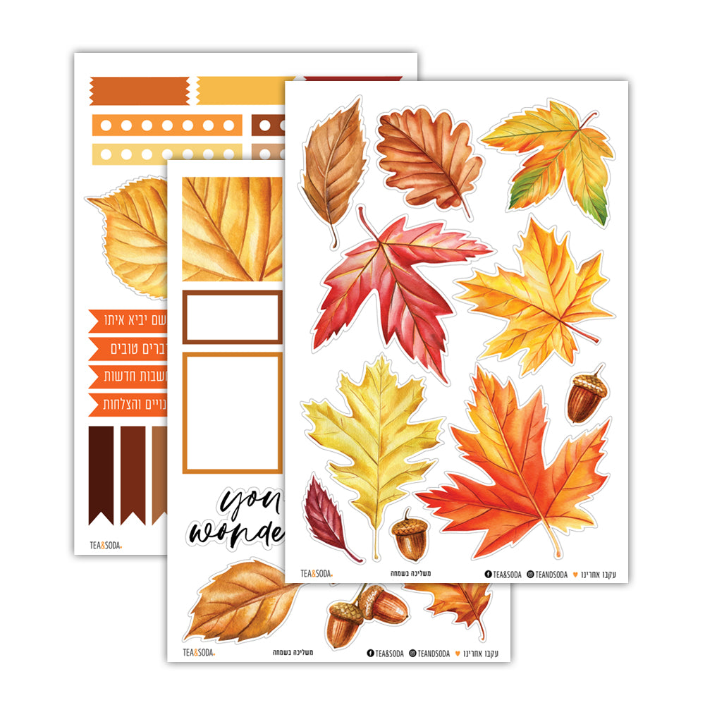 ֿמארז מדבקות ליומן, מכיל איורי עלי שלכת, אלמנטים צורניים וטקסטים לתכנון וקידום עשייה. המדבקות ניתנות לשימוש גם כמדבקות לברכות, עיצוב אלבומים, כרטיסי ברכה, אריזות ועוד. מודפס על מדבקה שקופה, שלושה דפים במארז