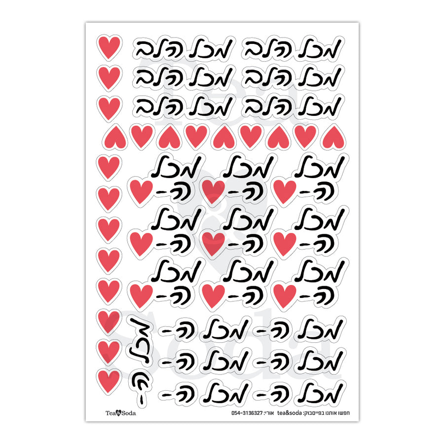 מדבקות עם הכיתוב מכל הלב. מתאים כקישוט לברכות, אריזות מתנה, אלבומים או פתקים קטנים מודפס בשחור על מדבקה שקופה, גליון אחד